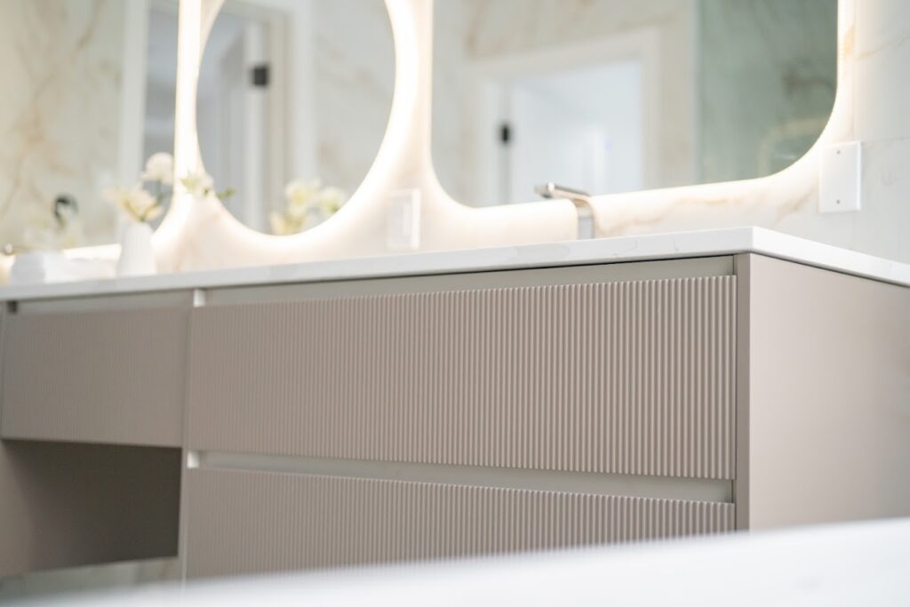 Custom bathroom cabinets are ideal when you care about durability and daily practicality—especially in shared bathrooms. With custom, you can tailor height, width, drawer configuration, linen storage, and countertop integration. You can also match the design language of the kitchen so the home feels intentional rather than “room by room” random.